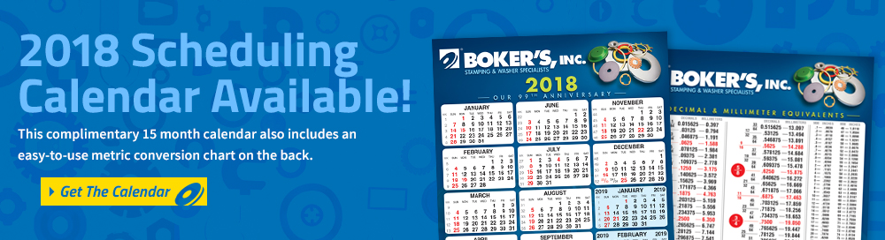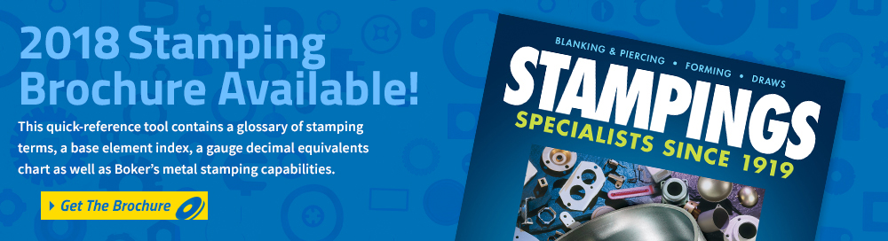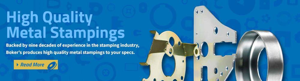 In addition to custom washers, spacers and shims, Boker's has been providing quality precision metal stampings since 1919. Boker's stamping capabilities covers a complete range of sizes up to 12" x 12" (flat) with thickness from .005" to .134" and deep draws up to 3" deep and 8" in diameter. From complex metal forms and deep draws to intricate metal piercings Boker's has the expertise and capacity to be your metal stamping manufacturer for short, medium or long-run orders.